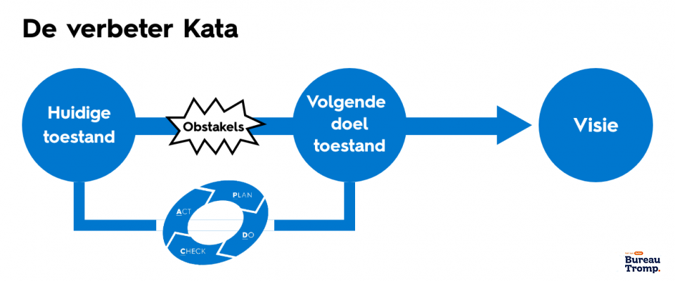 KATA veronderstelt dat het management een visie heeft. Deze visie is leidend en loopt top-down. Aangezien een visie redelijk vaag is, wordt een meer specifieke uitdaging vastgesteld die in lijn ligt met de visie. Vervolgens wordt van onderaf, in haalbare en overzichtelijke stappen toegewerkt naar de richting van de visie. Door het uitvoeren van vele kleine en kort opeenvolgende stapjes, zie je dat er na een tijdje een grote vooruitgang is geboekt. De nieuwe constante is de manier waarop je iedere keer een stapje maakt, dat is een vaste routine. Het is de vaste manier waarop je met verandering omgaat. Dat geeft mensen hun houvast.